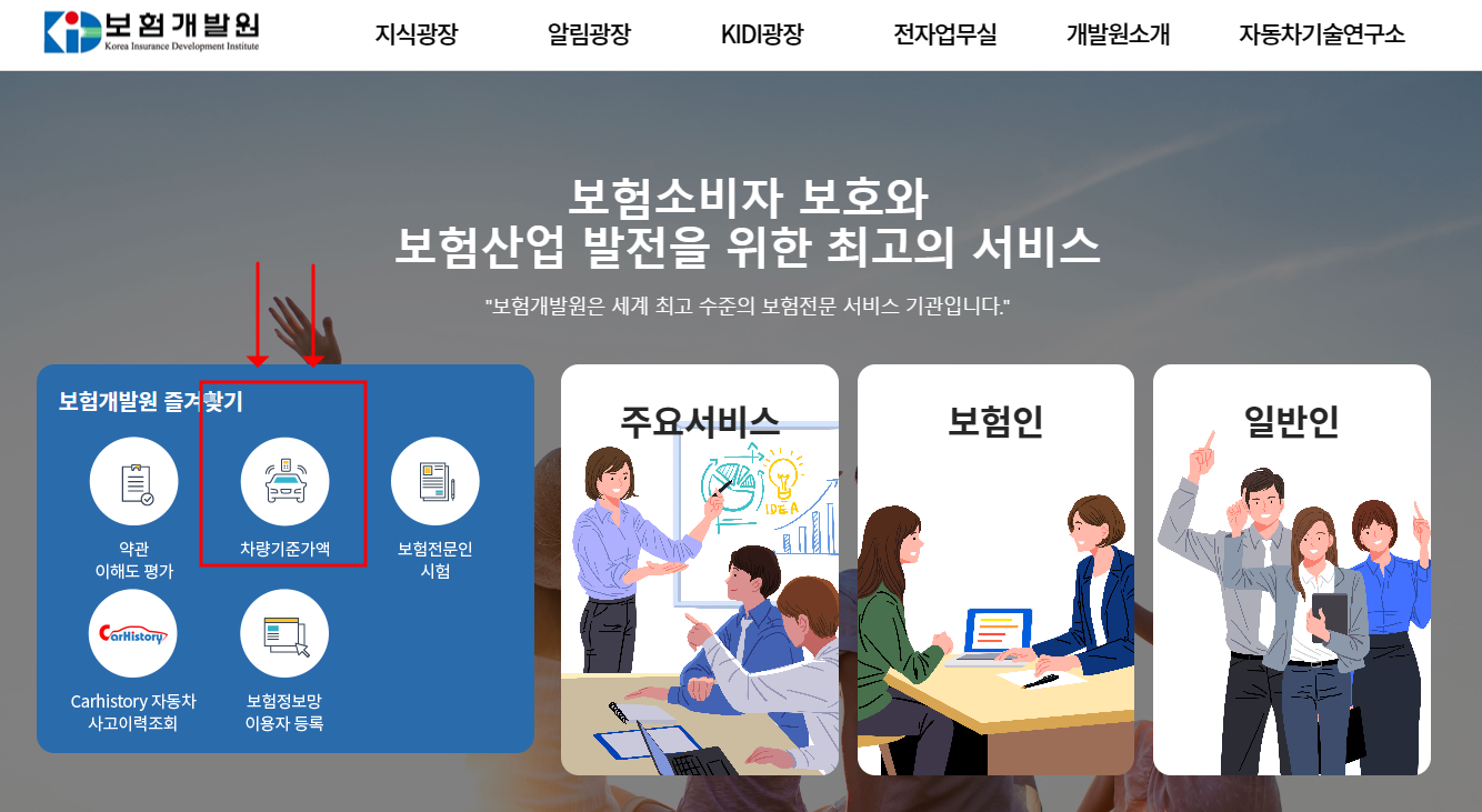 사이트 접속후 메인화면에서 보험개발원 즐겨찾기 > 차량기준가액 클릭